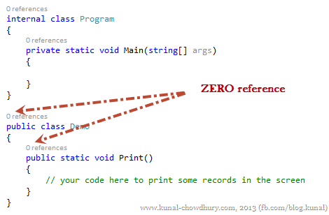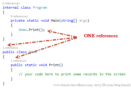 Now call the Print() method of the class from Program class and you will immediately notice that the reference count automatically increased to one and showing as “1 reference”. This means, you used it in only one location. Have a look at it here: