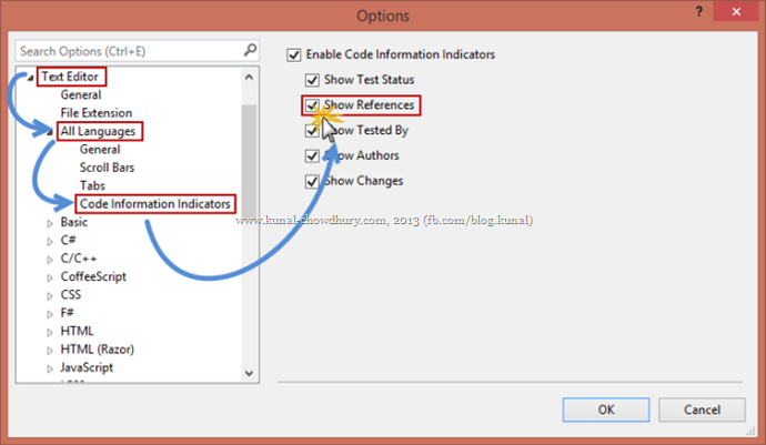 The settings for the reference counter is enable by default but in case you did not find the behaviour in your Visual Studio 2013 IDE, you can easily enable it by going to the options page. To enable/disable it, go to Tools –> Options and then navigate to Text Editor –>All Languages –> Code Information Indicators at the left pane of the dialog. In the right pane, you will find a parent check box labelled “Enable Code Information Indicators” and a child check box labelled “Show References”. To enable this reference counter in your code file, both of them needs to be checked. In case, you don’t want it, just uncheck the child check box labelled “Show References”.