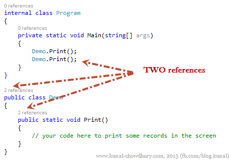 Let’s assume, we have a class called Demo and there is a static method (to demonstrate it easily) named Print(). By default you will see them marked with “0 references” at the top of each declaring line. This means, you did not yet use the class and the method. Have a look into the following example: